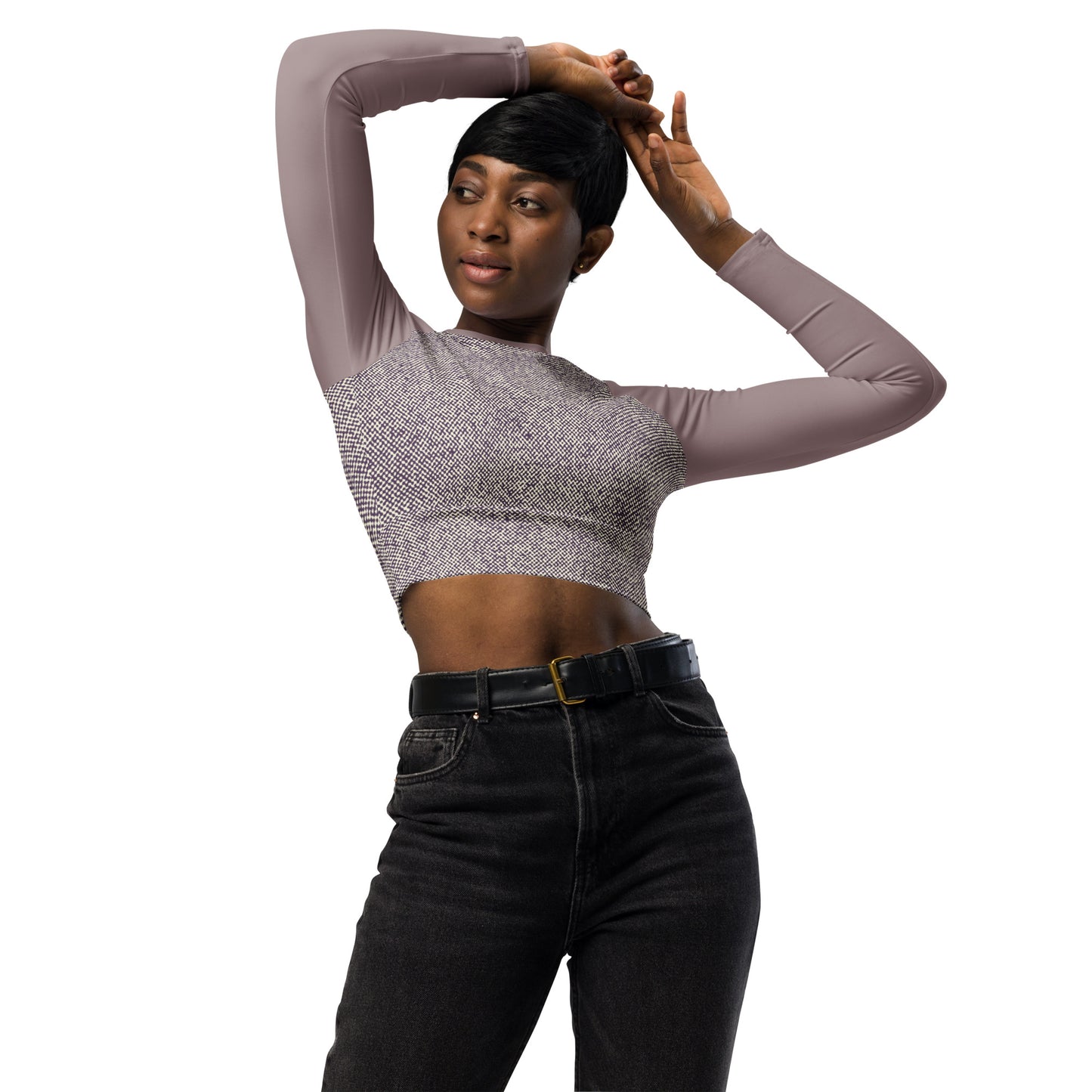 Eco-friendly, long-sleeve crop top made of recycled polyester and elastane. Tear-away care label and a wide, double-layered waistline band for a comfortable fit. Perfect for swimming, sports, or athleisure outfits.