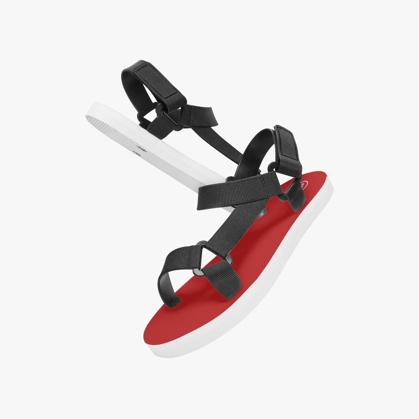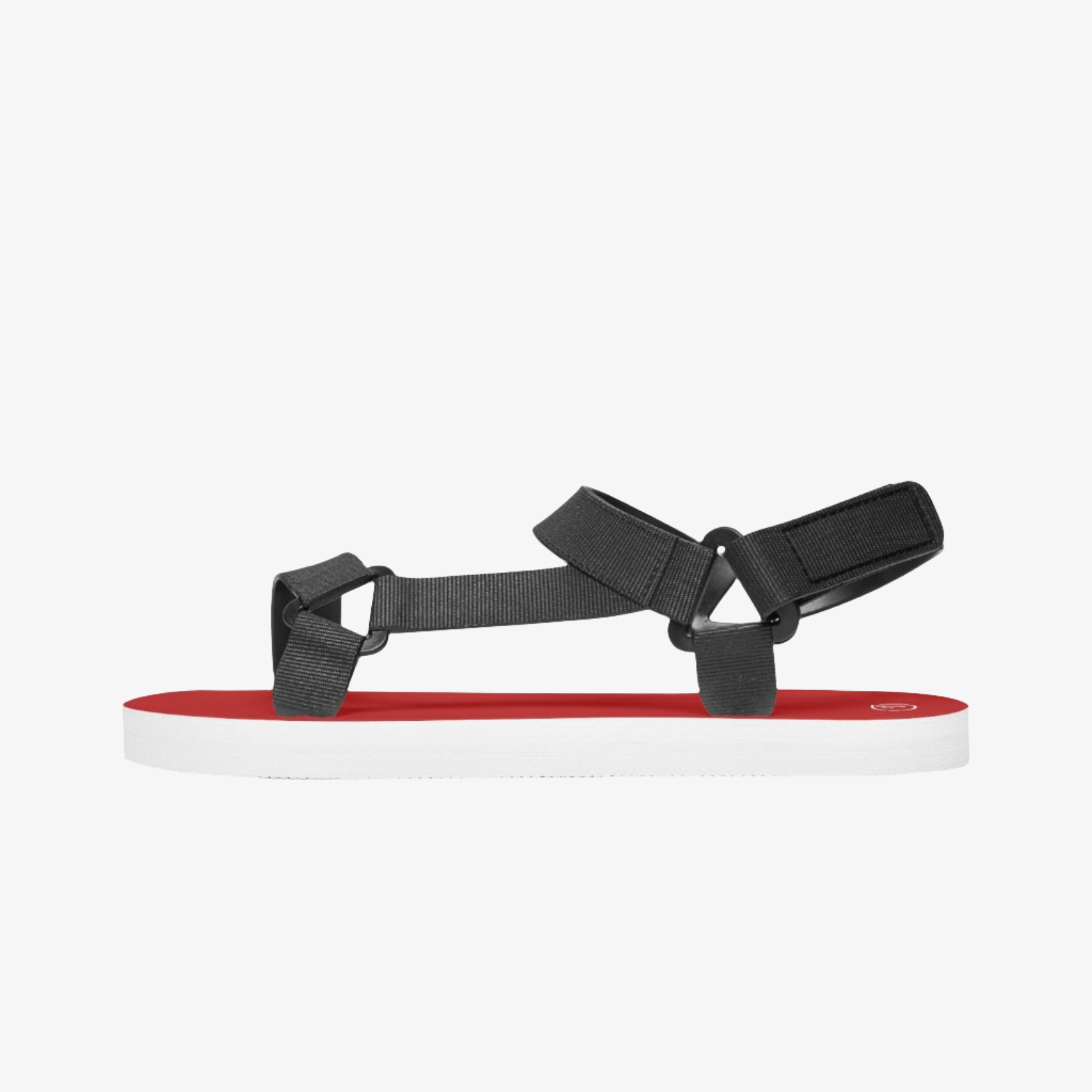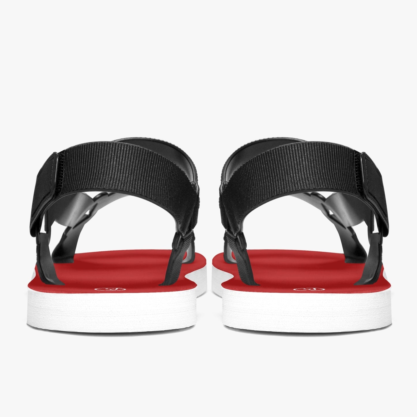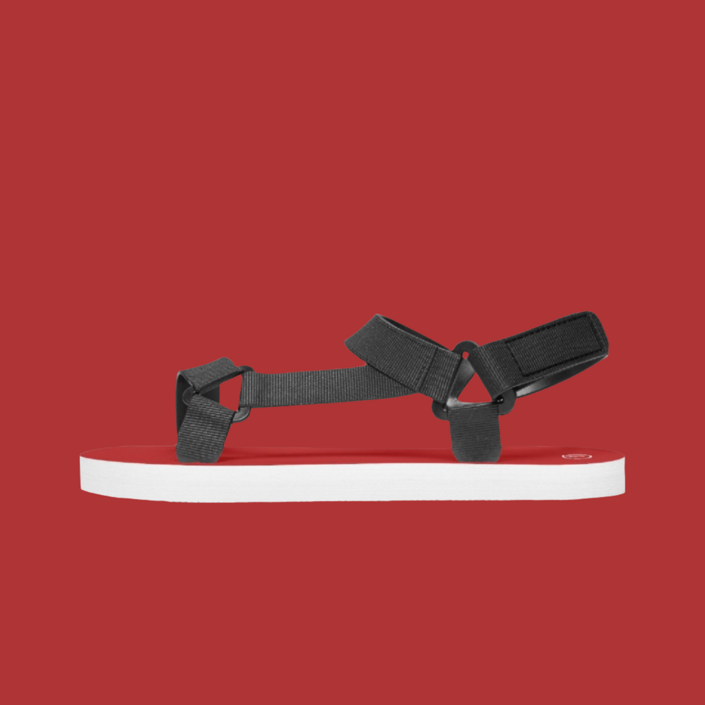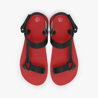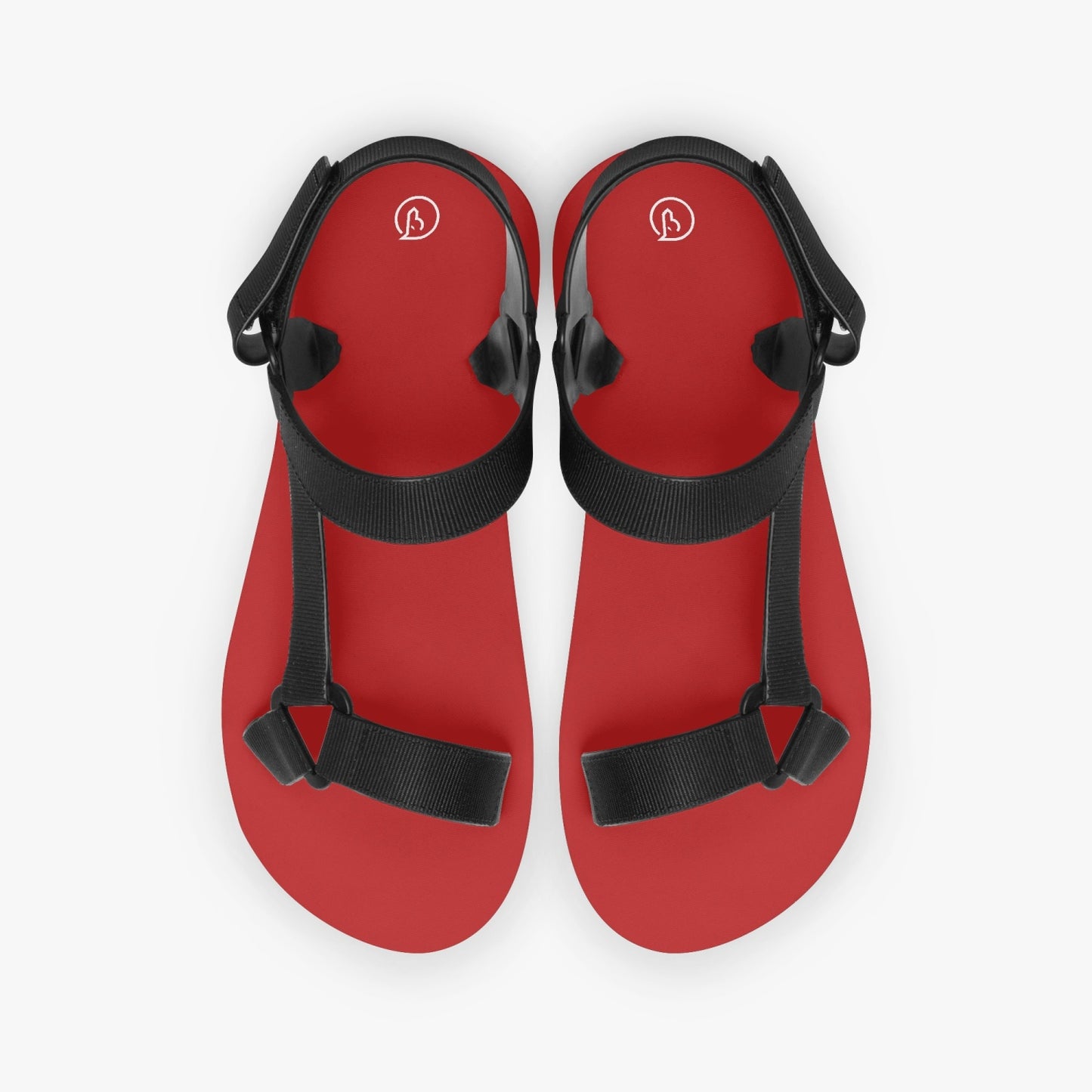 Women's red strappy sandals. Slip-on sandals with adjustable velcro straps and red insole. Perfect for casual or beachwear.